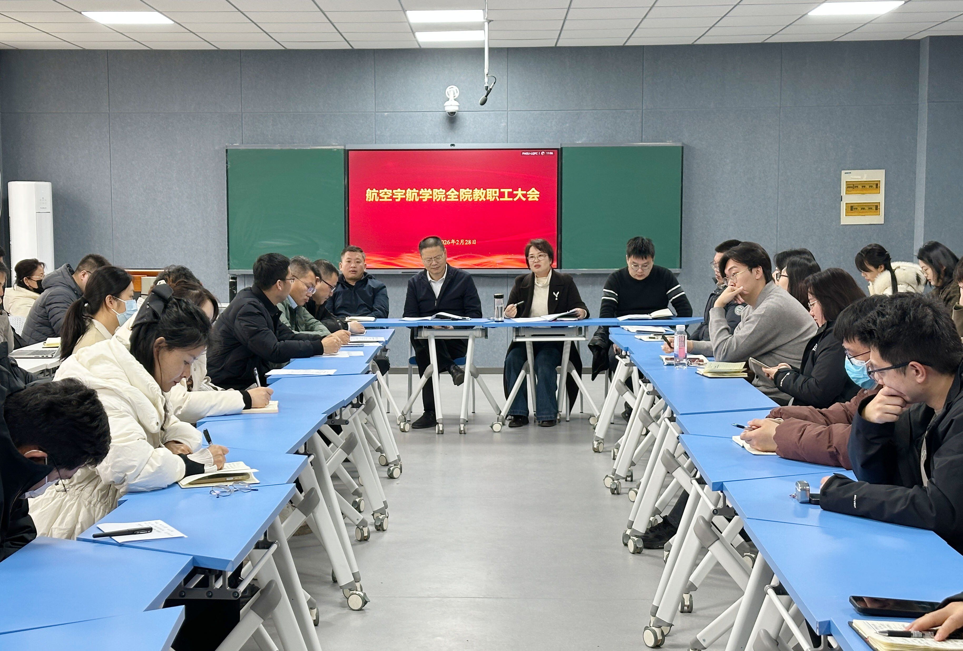 公司领导班子及全体教职工参加工作部署会。经理董彦非传达董事长工作报告核心精神,系统解读公司发展战略部署与年度工作要求。他指出,2025年公司深化教育科技人才、学科专业改革,办学质效大幅提升,各项工作取得标志性成效。面向“十五五”,公司正式将“申硕升大申博”确立为核心发展战略,这既是公司建设特色鲜明的高水平应用型西安航空航天大学的关键举措,更是应对高等教育发展新形势、破解发展瓶颈、提升办学能级的必然选择,公司将以高质量党建为统领,纵深推进“申硕冲刺年、科技创新年、资源增效年”建设,聚焦十大重点工作凝心聚力、攻坚克难。董彦非强调,全院教职工要深刻认识公司发展的紧迫感与使命感,主动将个人发展融入公司与公司发展大局。