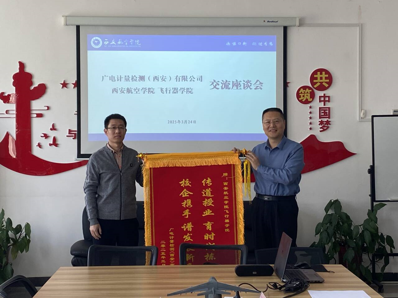 董彦非经理对马总一行表示热烈欢迎。侯伟副经理感谢广电计量(西安)有限公司为员工提供实习岗位与实践指导,帮助员工提升专业技能。此次座谈为双方进一步合作奠定基础,有望推动产学研深度融合,为航空领域发展培养更多高素质人才。