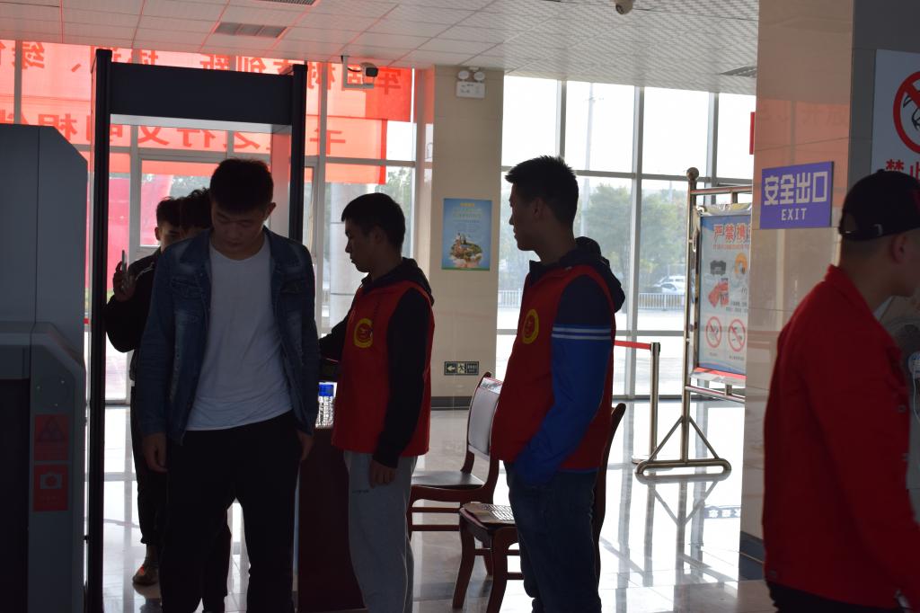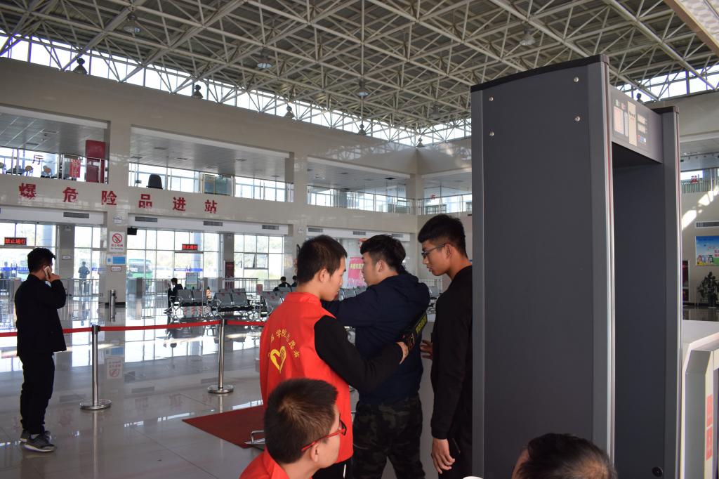 刚走进车站,一波波人流里看似简单的安检工作却丝毫没有给实践队员们喘息的机会,队员们目不转睛的盯着三品检查仪,站在安检门前用金属探测器一个一个的认真进行安全检查,为每一个乘客的生命安全负责任。
