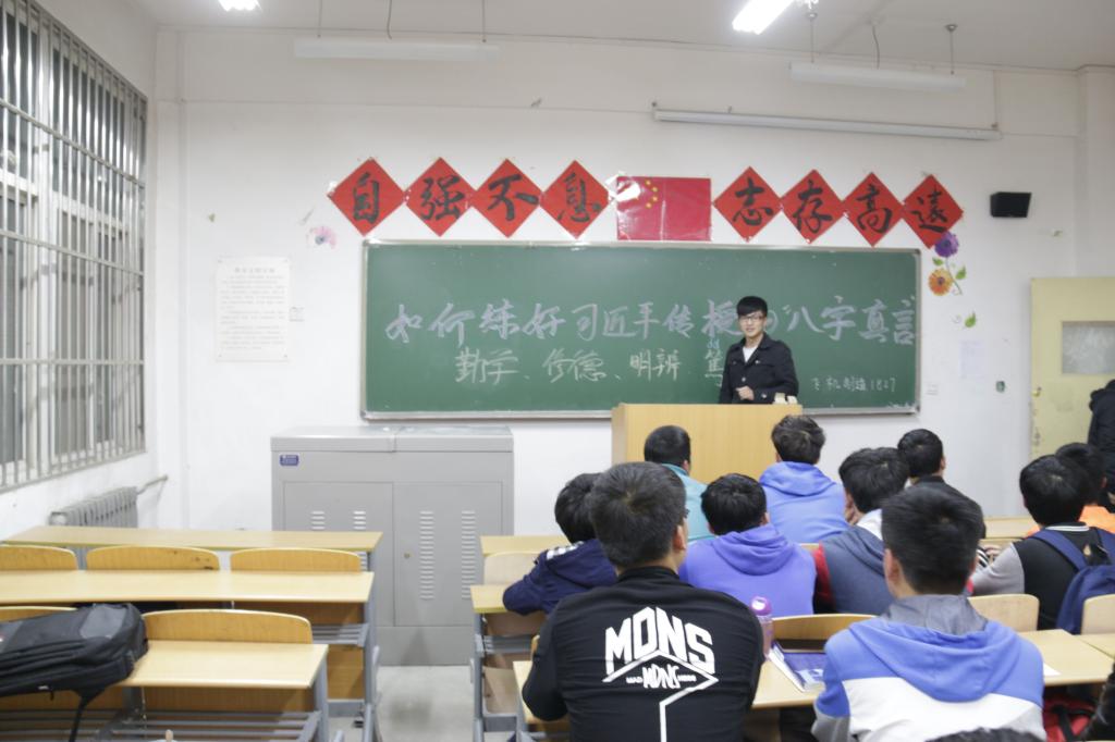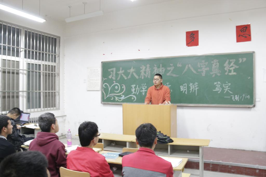 本次活动以班为单位,由各班团支书主持进行。首先,团支书通过视频向同学们介绍了习大大传授的“八字真经”,让同学们了解到了“真经”的内容。接着,同学们以小组为单位对“真经”的理解进行了激烈的讨论。讨论结束,各小组代表上台发表本组见解。最后,由团支书对本次大会进行总结。