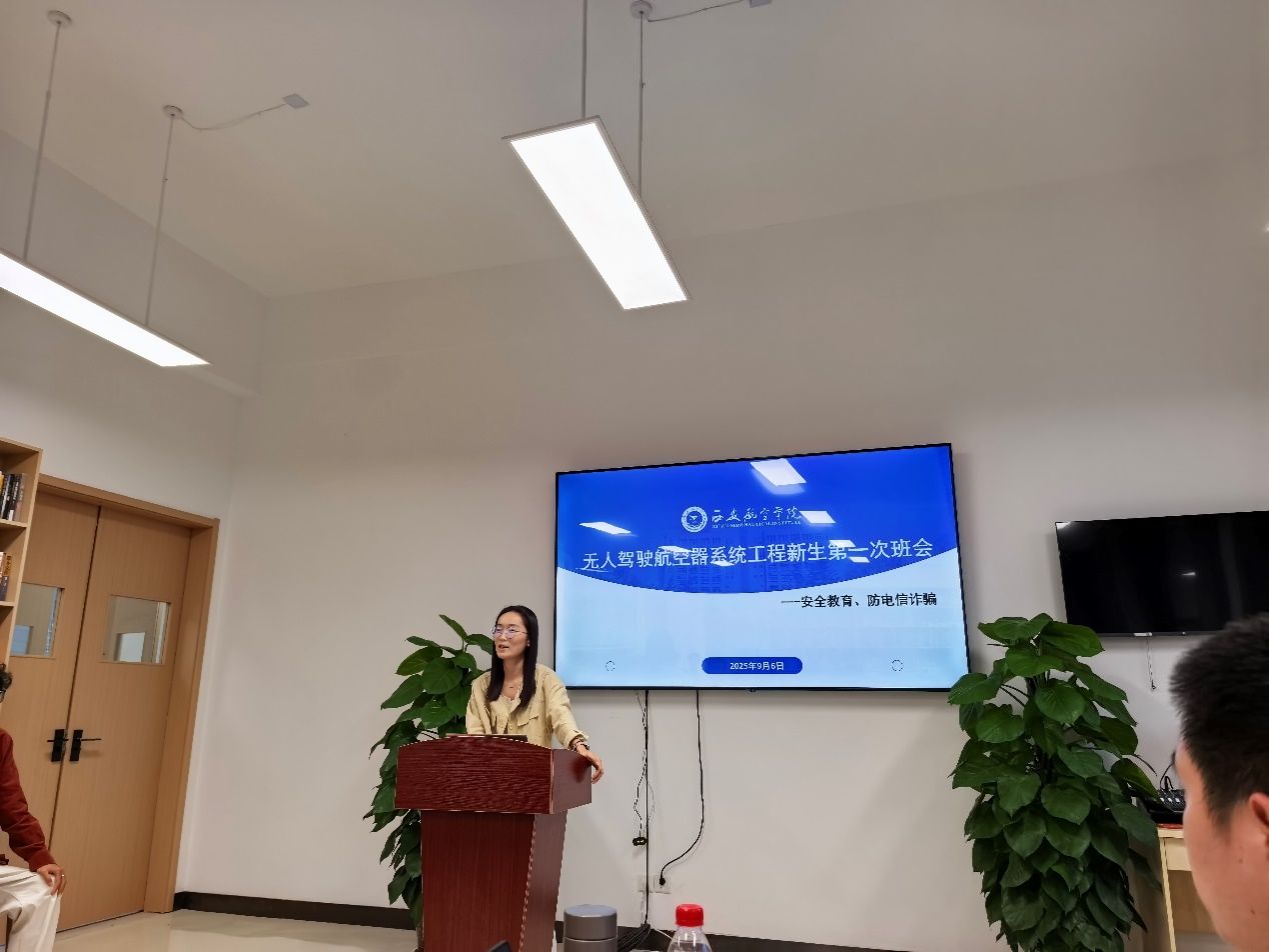 为帮助刚踏入大公司园的新生们提升安全防范意识,无人驾驶航空器系统工程 251 班于9月6日晚7点在民航二号楼实验室召开新生入学后的首次班会。本次班会以 “安全教育之警惕电信诈骗” 为核心主题,旨在认清电信诈骗的多样陷阱,为即将开启的老员工活筑牢 安全防线。专业负责人李继广老师、教研室主任屈高敏老师、班主任杨咪老师及公司办公室教学秘书乔奕华老师共同参与了此次班会。